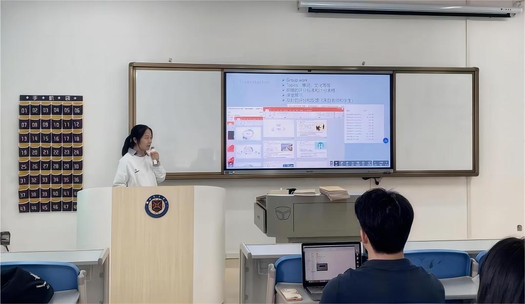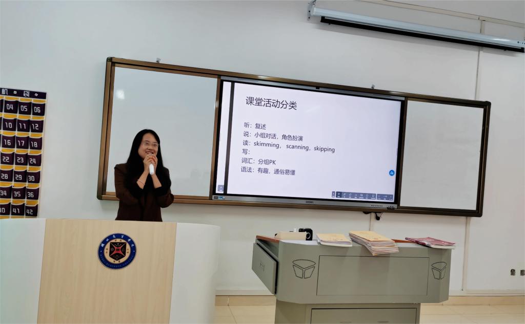 袁环老师认为员工才是课堂的“主角”,在课堂上因材施教,开展形式多样的教学活动。她将大学英语分为听、说、读、写、词汇和语法六个部分,有针对性地安排课堂活动,例如角色扮演、分组PK、听写复述等。本次教研活动中,她针对枯燥的语法学习,分享了语法时态的游戏教学演示。以一首歌英文作为导入,带着同学们学习并运用现在进行时等时态,通过巧妙的PPT动画设计和贴近生活的看图猜题游戏,引导同学们大胆开口讲英语,课堂氛围活跃。师者,所以传道授业解惑也。她坚信,老师不仅仅是知识的传递者,更是员工成长的引路人,要关注员工综合素质,培养员工听说读写全面发展的英语能力。