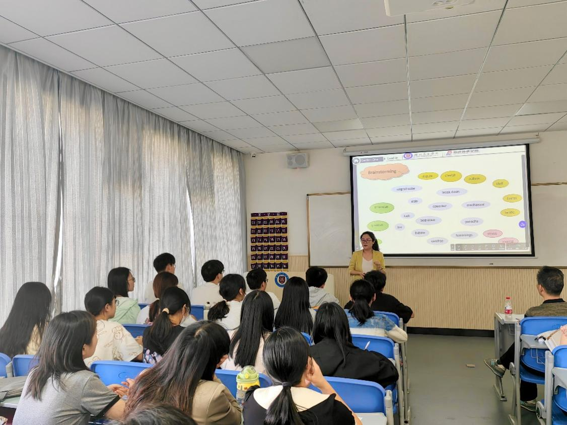 示范课环节,邓妍老师讲授《综合英语1》课程。她以英语专业人才培养目标为核心,介绍了“综合英语1”课程设计,阐述了OBE教学理念,BOPPPS和TIPT教学方法在英语课堂中的运用,并以词汇头脑风暴导入示范课程。TIPT适用于引导员工通过对字词句进行信息化加工处理以最终达到记忆和理解的目的,邓妍老师就这项教学模式给老师们做了一个实践展示。