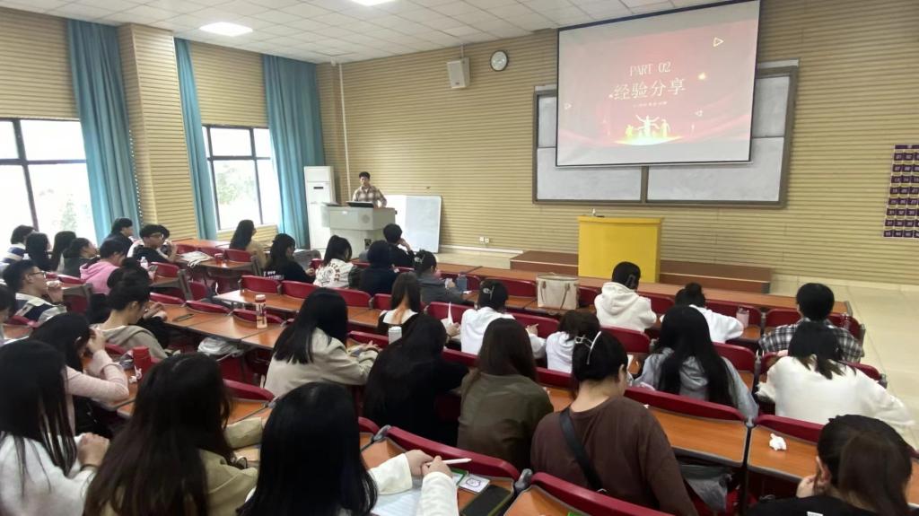 已经拿到专四证书的胡星星同学首先从背单词方法进行介绍,她向我们推荐了不背单词app,可以充分碎片化时间进行单词记忆。以及听力经验技巧分享,她说到听听力时要全神贯注,同时在题目旁边作下标记。也给大家推荐了语法、完型和阅读的练习书目,并且给予了一些她个人备考总结下来的小技巧,强调专四作文一定要卷面整洁,逻辑清晰。最后强调了真题的重要性,重点弄懂选择题。