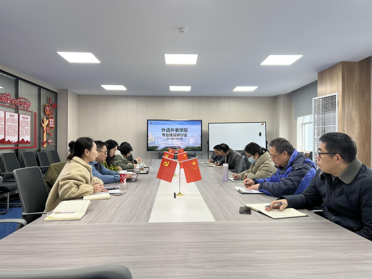 2023年2月16日中午,外语外事公司在图书馆七楼召开了专业建设研讨会暨学期初教学工作布置会,会议由经理王谷子主持,公司党总支书记殷雄,公司班子成员与各课程组负责人参加了本次会议。
