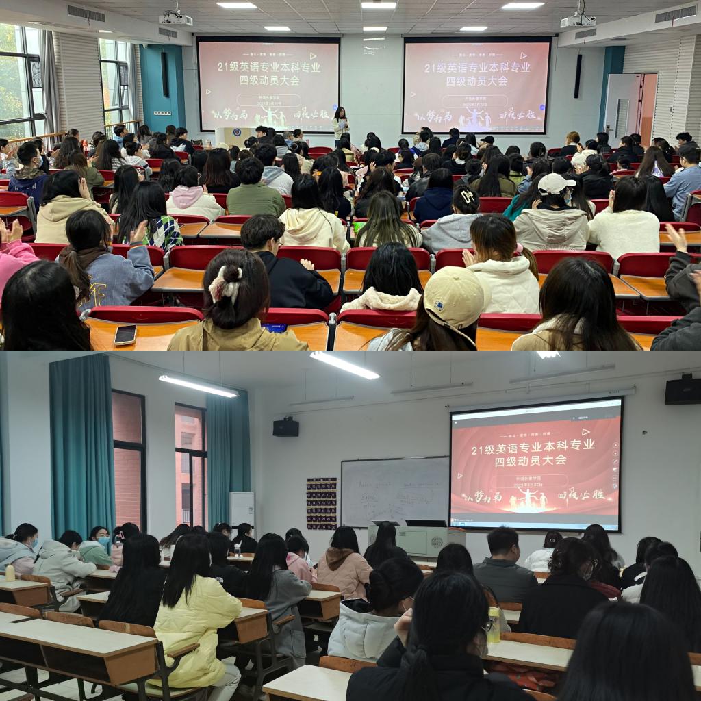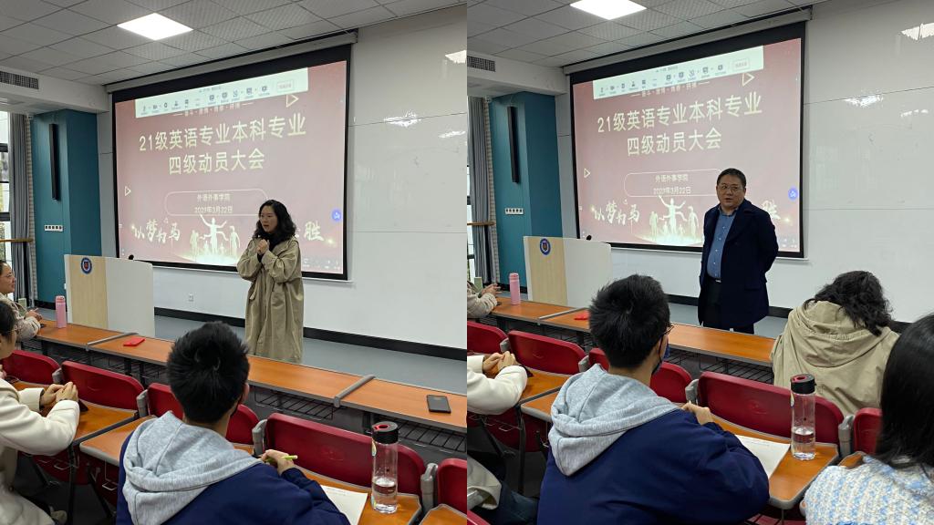 3月的校园,草长莺飞,春意盎然。322日中午,外语外事公司在鸿博楼J2教室召开了21级英语专业本科专业四级考试动员大会,咸宁校区专升本员工在线上同步参会。外语外事公司经理王谷子、副经理余昊、21级全体授课教师、21级英语专业本科员工参加了会议。