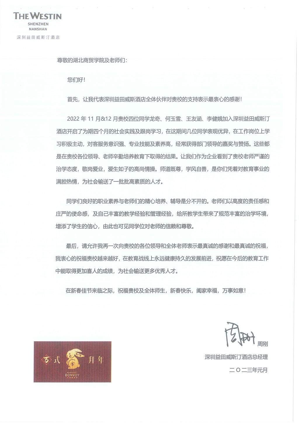 实习期间,四位同学在岗位上积极主动、服务意识强、专业素养高,获得部门上下的一致好评。春节期间,深圳益田威斯汀酒店周刚总经理代表酒店特意发来了感谢信,对几位同学的工作给与高度评价,并赞扬了公司老师严谨的治学态度及爱生如子的情操和优良的学风。