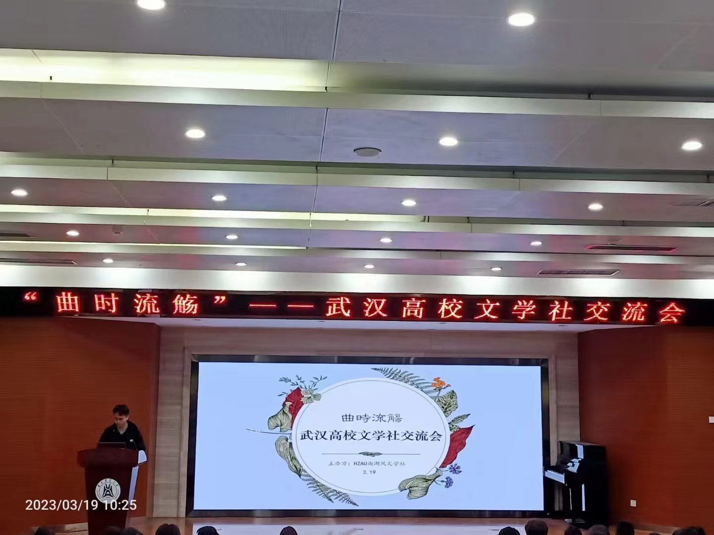 2023年3月19日,公司22级学子徐亚龙同学,随争鸣文学社代表团参与华中农业大学武汉高校文学交流会。此次活动,众多文学社来到华中农业大学,齐聚狮山下,进行武汉高校文学交流,以增进学子文学文化底蕴。