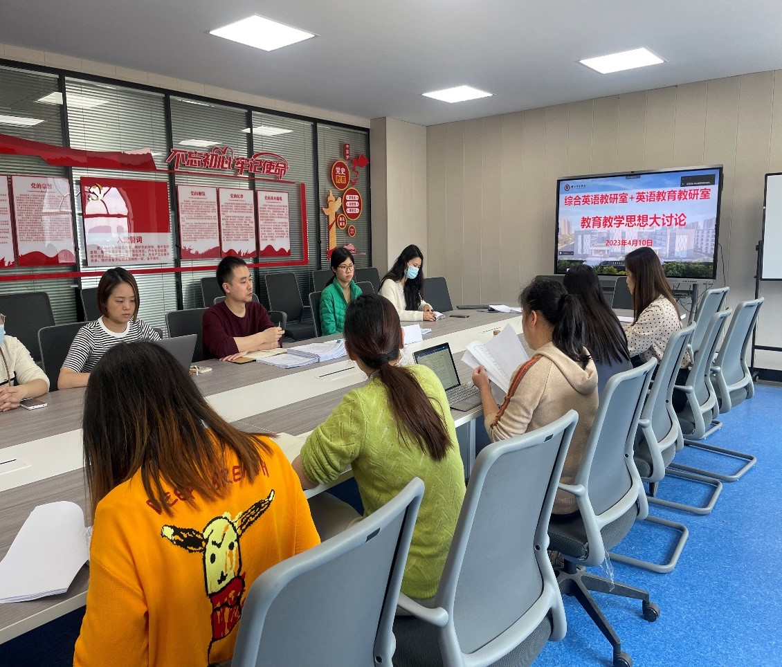 4月10日下午,综合英语教研室课程组全体教师在公司会议室开展了教育思想大讨论、本科评估要点的会议。会议由综合英语教研室主任邓妍主持,课程组全体教师参加,咸宁校区同步线上参会。