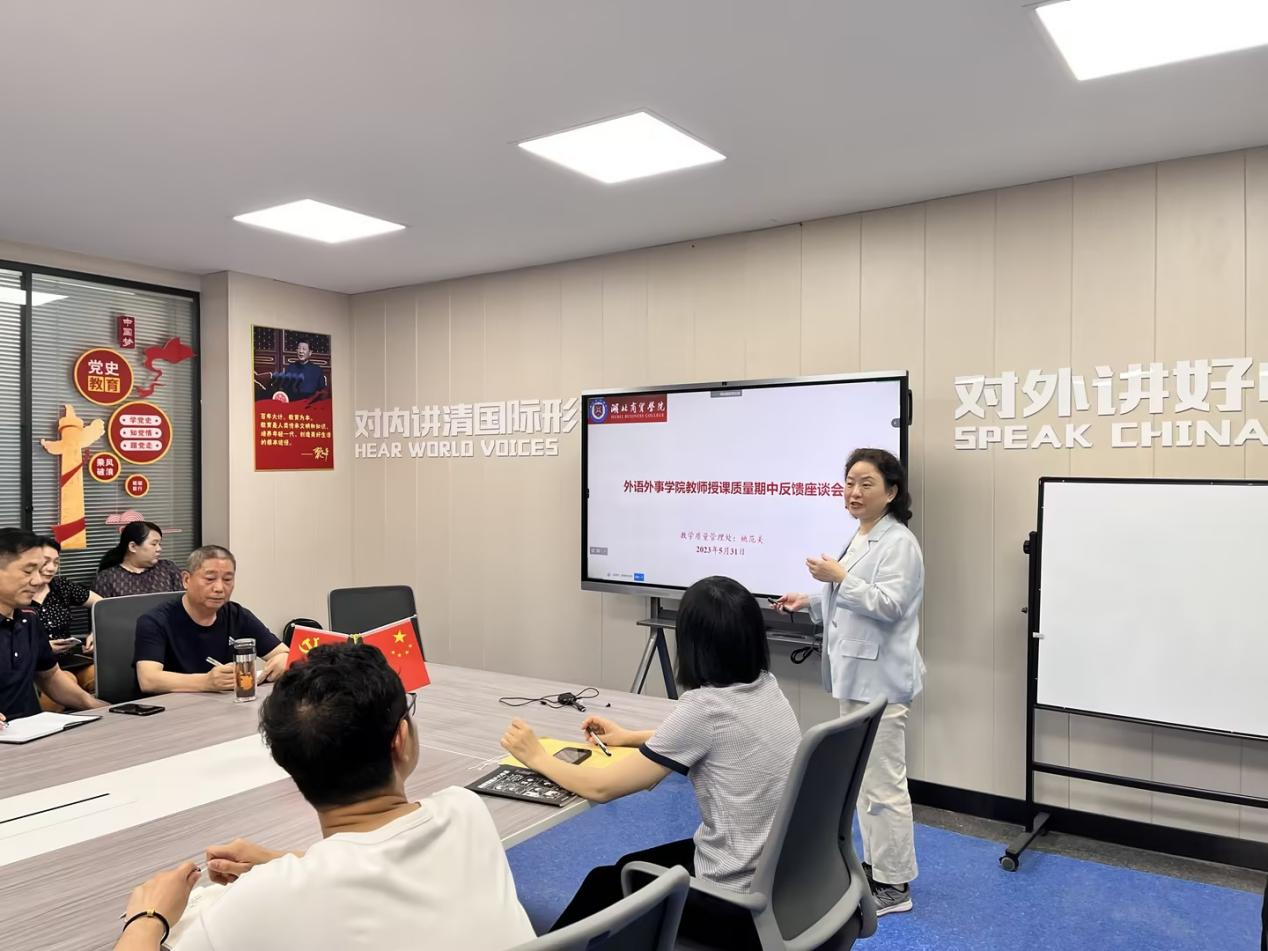 为提升教师教育水平,打造高效课堂,5月31日下午,外语外事公司在公司会议室召开教师授课质量期中反馈座谈会。此次座谈会由教学质量监督管理处牵头,外语外事公司具体组织落实。教学质量管理处督导姚范美受邀作反馈报告,外语外事公司全体教师参与本次座谈会。会议由外语外事公司副经理武艳霞主持。