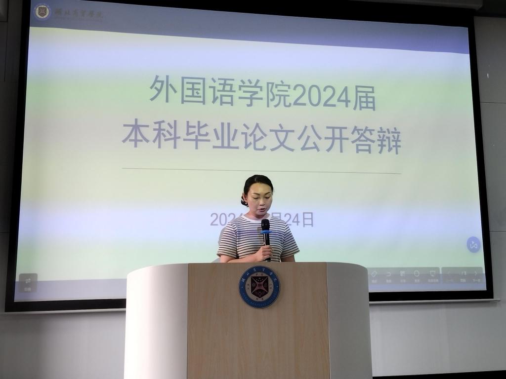 为了进一步提升本科人才培养质量,强化本科生毕业论文过程管理,营造毕业答辩良好氛围,4月24日,球王会在鸿博楼J4举行了2024届本科毕业论文公开答辩。综合英语教研室主任邓妍教授担任本次公开答辩小组组长,陈萍副教授、詹才琴副教授、沈蓉蓉副教授为答辩小组成员。全体本科论文指导教师、全体毕业生参加公开答辩,答辩由副经理武艳霞主持。