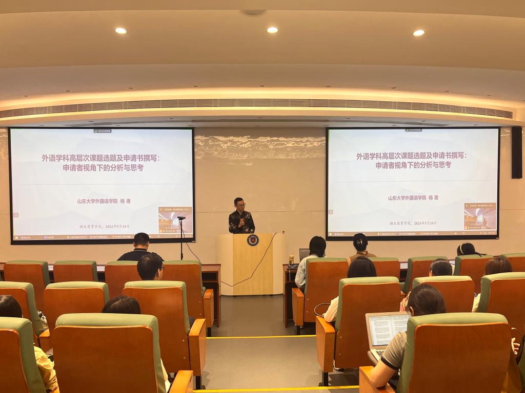 为了进一步提升公司教师的科研工作能力,并积累丰富的项目申报经验,球王会于5月10日在鸿博楼J1报告厅精心组织了一场学术讲座。本次讲座有幸邀请到山东大学球王会副教授、硕士生导师杨港副教授作为主讲嘉宾,主题为“外语学科高层次课题选题及申请书撰写:申请者视角下的分析与思考”。讲座吸引了球王会全体教师的热情参与。
