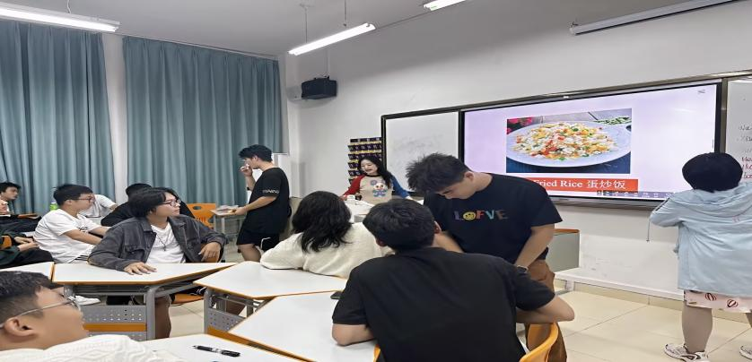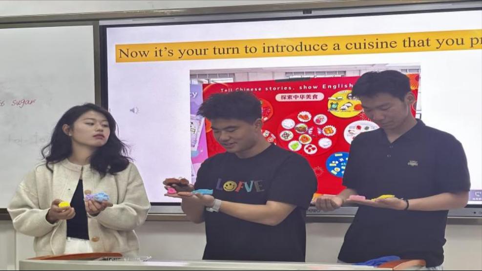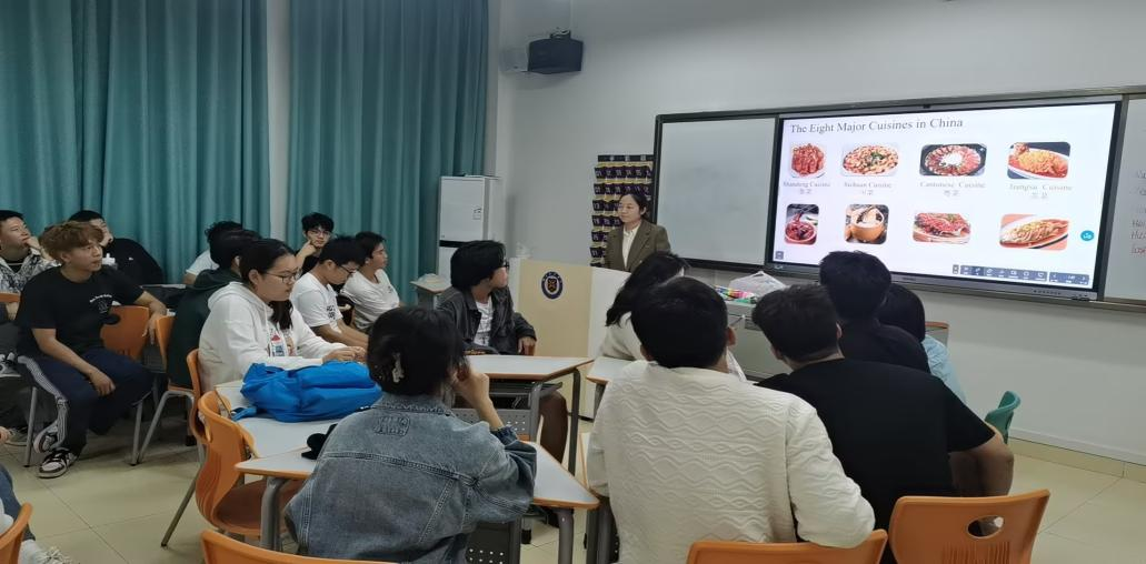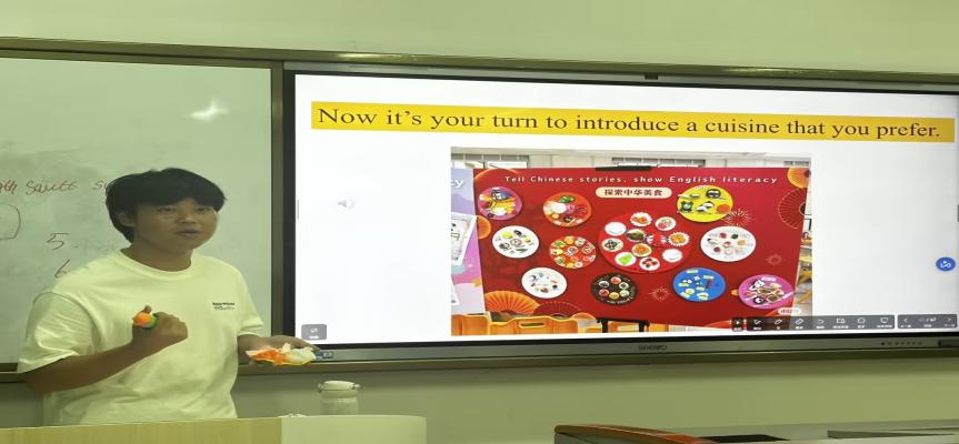 除了精彩的游戏,指导老师们还为同学们介绍了中国八大菜系。刘梦琪老师采用图文结合的方式,为大家进行了基本介绍,让大家看图猜菜名,并介绍了一些代表性中国菜的英文表达。随后,刘梦琪老师对川菜展开了详细介绍,涵盖川菜的特点、烹饪方式以及特色菜。以麻婆豆腐为例,刘梦琪老师从原材料、质地、口感、做法等方面用英文进行了细致入微的讲解。紧接着,高泉老师对京菜和楚菜进行了详细介绍。同时,高泉老师选取东坡肉作为例子,通过一首外国人自编的关于东坡肉的歌曲视频进行生动讲解,并辅以图片和文字,对相关的英文表达进行了详尽解释。