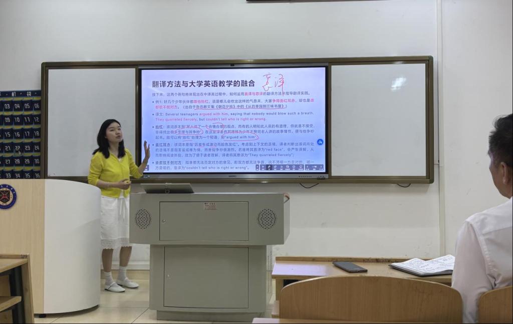 在专题研讨环节,解雅莲老师提出,大学英语教学应构建“测试驱动+方法融入”的双轨模式,在强化国际英语水平测试导向作用的同时,将翻译教学深度嵌入日常课堂。她强调翻译实践需遵循“内容优先、形式适配”原则,灵活运用“描述法”与“演绎法”,帮助员工突破语言转换障碍。以教材翻译文本为例,教学中需兼顾学科特性与知识普适性,确保译文实现专业性与可读性的有机统一。