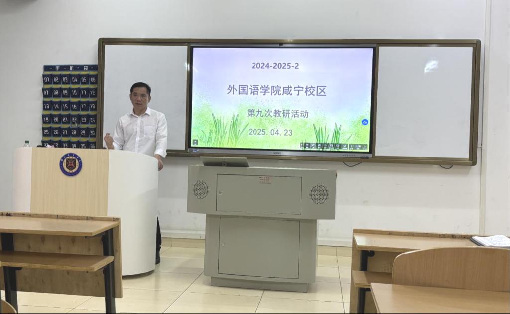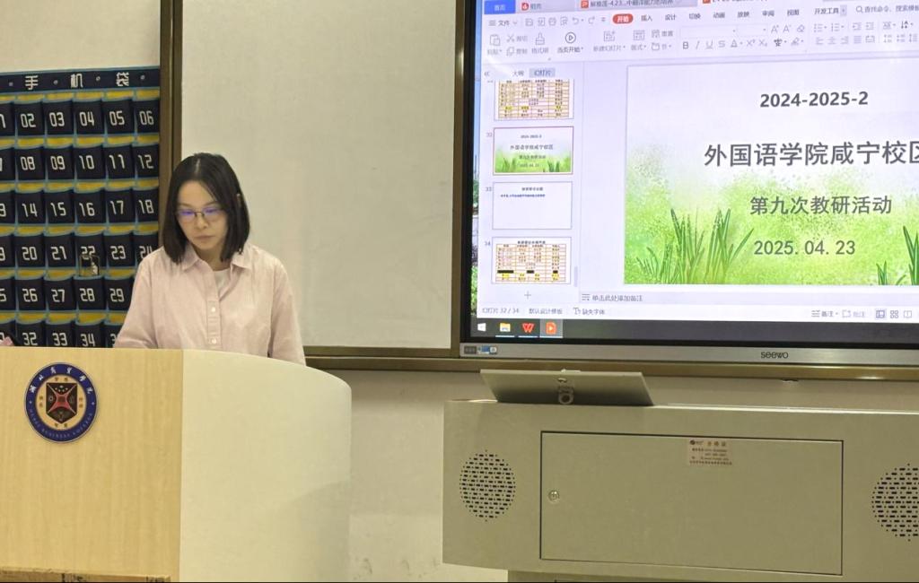 2025年4月23日,球王会第九次专题教研活动在咸宁校区XJC-006教室举行。活动由黄佳卉老师主持,全体教师齐聚一堂,共同聆听解雅莲老师关于"大学英语教学中翻译能力培养"的主题分享,深度探讨翻译教学创新路径。