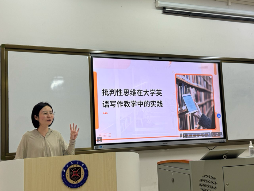 随后,尹莹老师分享大学英语写作实践课教学经验。她利用专升本写作真题进行练习,针对员工反馈不佳的情况,创新采用做5个quiz的方式,引导员工区分观点和事实,通过“观点+1个事实”短句模式优化写作教学。