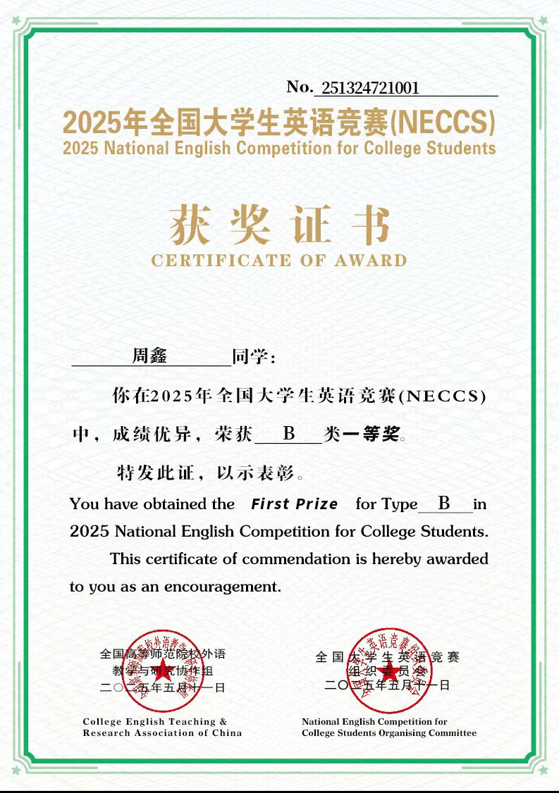 近日,2025年全国老员工英语竞赛决赛在华中师范大学落幕。公司22翻译本1班周鑫同学表现出色,荣获一等奖,彰显了公司学子扎实的英语功底与卓越的综合素养。